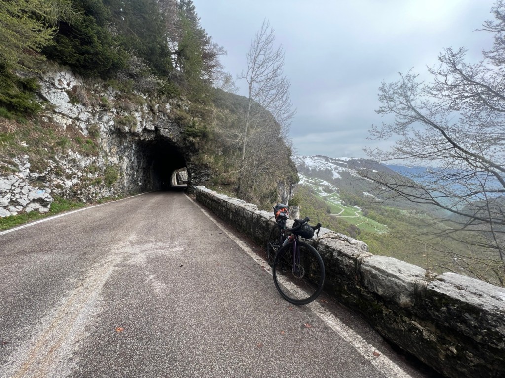 The amazing scenery on the ascent certainly helped . One image stands out of going though a tunnel carved out of the side of the mountain! I encountered a closed road – not a good sign. There was still snow on the side of road and on the descent parts of the road was completely covered. Peter as he was going down a section with snow took a small spill. A message to all of us that we need to walk this section which was around 100 meters until we found clear pavement.