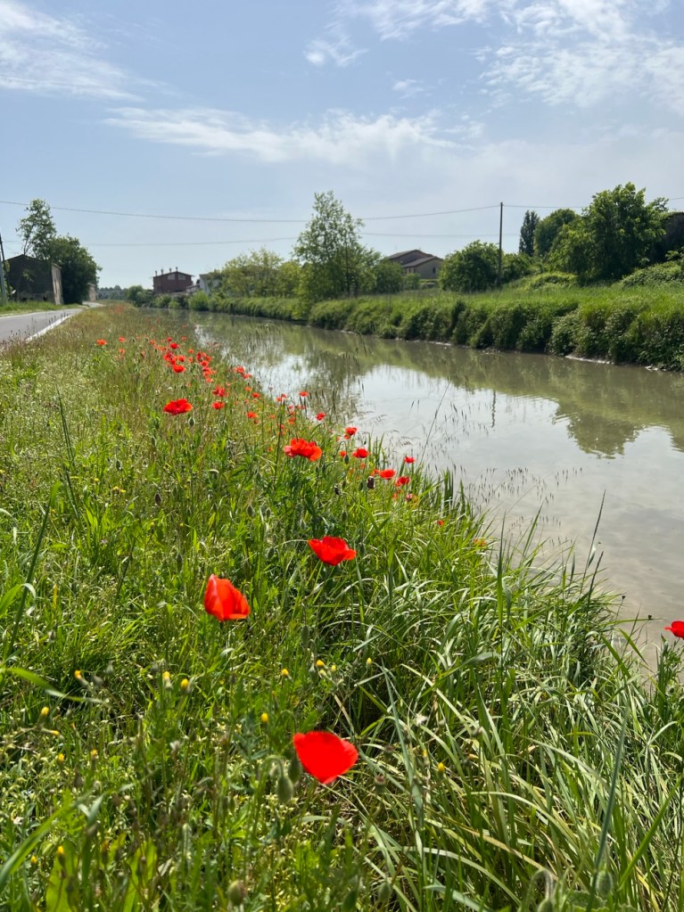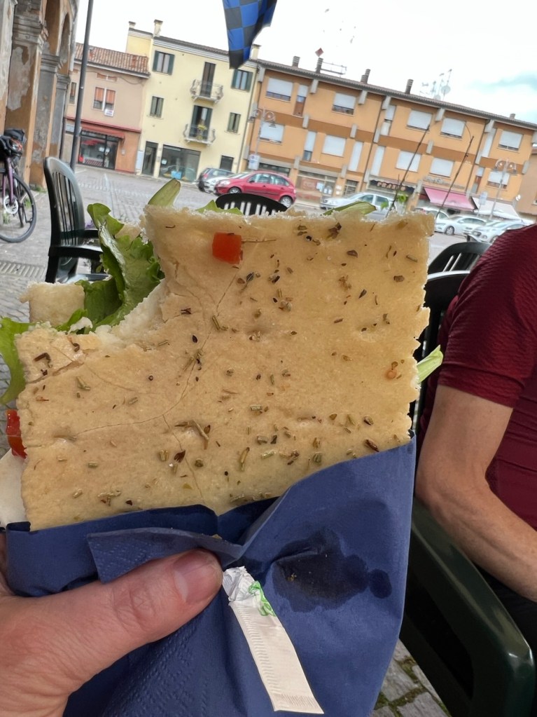 At the 75 km mark we found a bar that made us the most delicious focaccia sandwich with fresh tomatoes and cheese drizzled with olive oil! Paired nicely with lemon soda. Refueled for remaining 30 km.