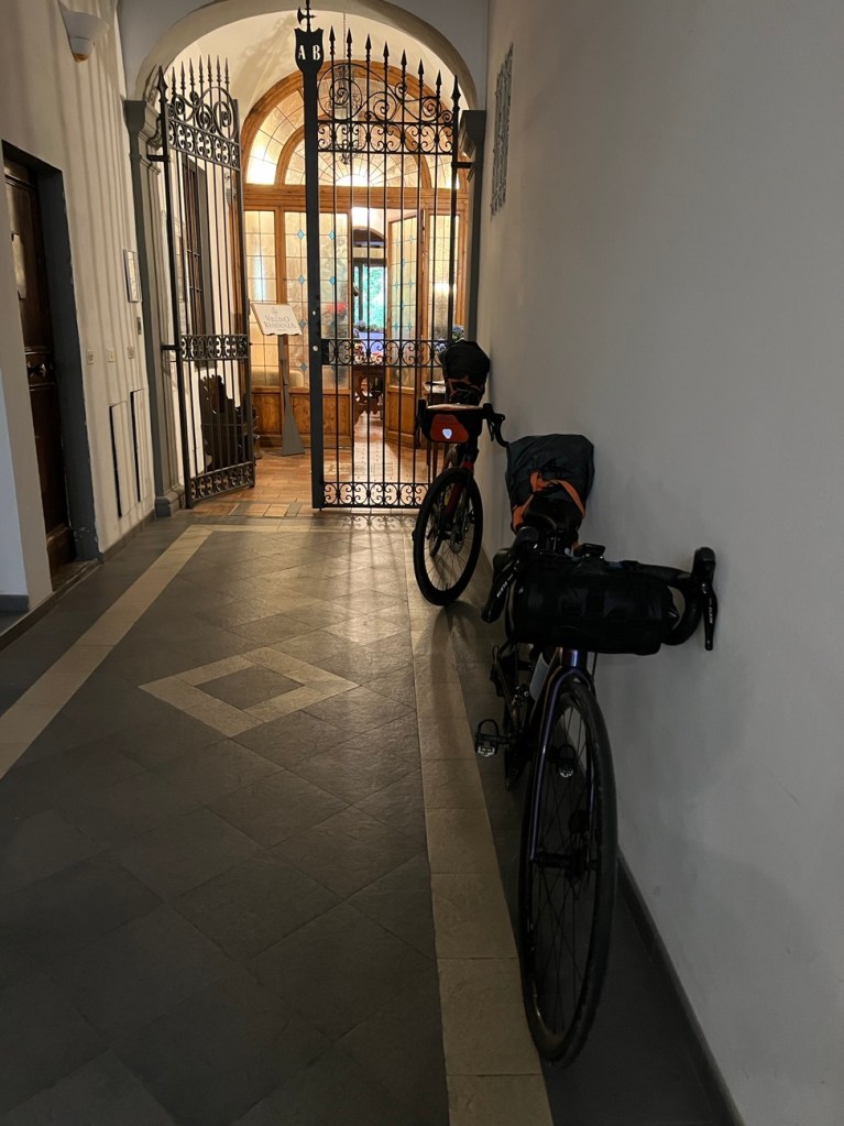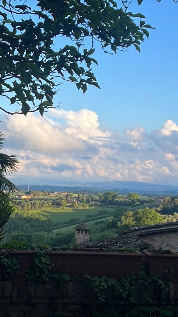 On the bikes again and back on track. Nice ride into sienna and fortunately no more rain. Arrived tired but a hot shower and an aperol spritz on patio with amazing view makes it all worthwhile!