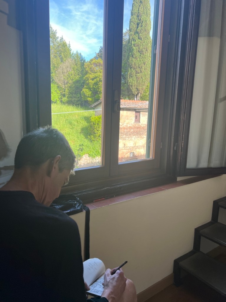 We had a day off to regroup – laundry and much needed bike maintenance. Peter is doing some sketches from a book bought in Florence.