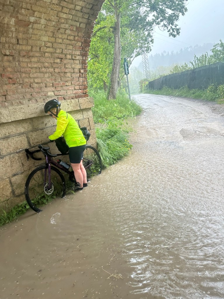 At 43 km we started looking for lunch but couldn’t find anything. At 50 km we saw dark clouds and knew we were going to get caught in the rain! You can hear the thunder and lightning and then it started to pour! And I mean really coming down fast and hard!